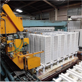 台車は自動制御されたトンネル窯(長さ70m、焼成帯最高温度1,260度)に入り、焼成されます。 |